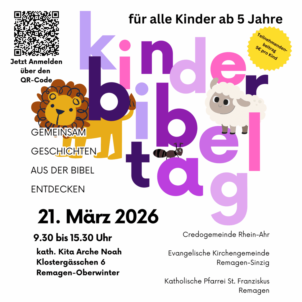 Wir freuen uns, dass auch in diesem Jahr wieder der Kinderbibeltag stattfinden wird. Gemeinsam mit der katholischen und der Credo-Gemeinde wollen wir mit den Kindern einen spannenden Tag gestalten. Um zum Abschluss findet mit den Eltern ein kleiner theologischer Impuls statt, bei dem die Kinder präsentieren, was sie erfahren haben.